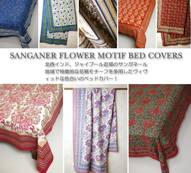 インド サンガネール シングルベッドカバー 花柄 ブルー系 ピンク系 エンジ系 【アジアン】【母の日】【インド綿】【マルチカバー】【ハンドメイド】【クラフト】【プレゼント】【エスニック】【インテリア】【コットン】【税込6,480円で送料無料!】